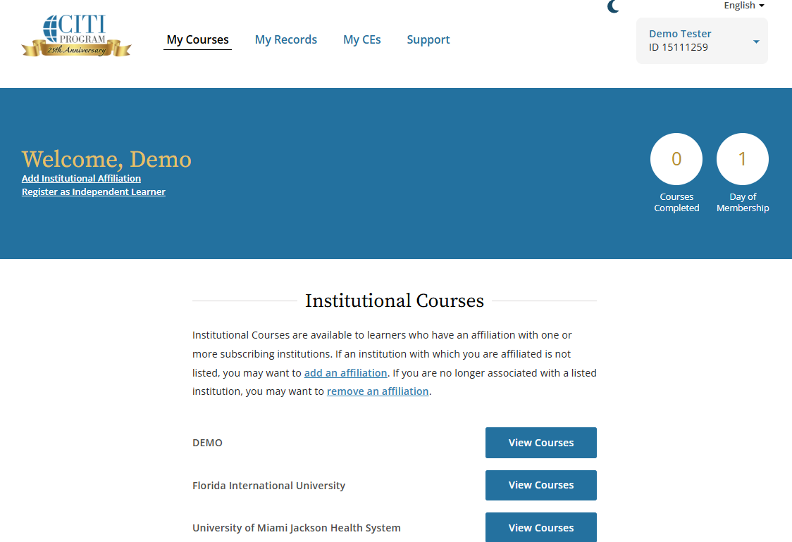 Note that some institutions allow access to their courses using both CITI Program credentials and SSO credentials. Others pick one or the other exclusively. Please reach out to an administrator at your institution for more information on the preferred login method(s) you'd like.